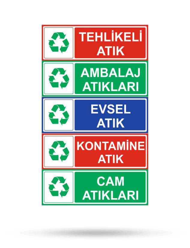 Geri dönüşüm ve atık levhaları, atıkların doğru şekilde ayrıştırılmasını ve çevreye zarar vermeden bertaraf edilmesini sağlamak için kullanılır. Plastik, kağıt, cam, metal ve organik atıklar gibi farklı kategoriler için özel sembollerle tasarlanırlar. Bu levhalar sayesinde hem iş yerlerinde hem de kamusal alanlarda çevre bilinci artırılır ve sürdürülebilir bir atık yönetimi sağlanır.